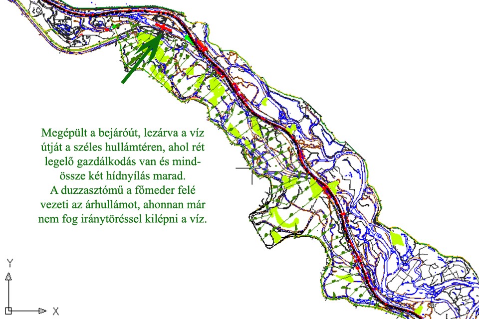 Ez egy igen lényeges mondat, mert arra utal, hogy a víz árvízkor nagyon is igénybe venné a hullámteret és ebben a magas párhuzamművek akadályozzák.