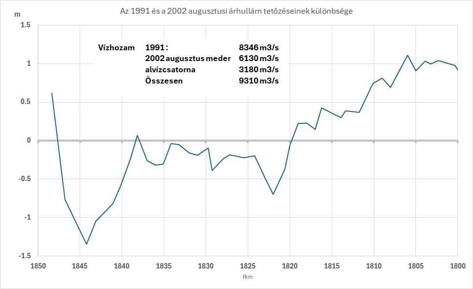 A 2002 árhullám szintjei azért is voltak meglepőek, mert a teljes hozam ugyan 964 m3/s-al magasabb volt az alvízcsatorna torkolata alatt, de már ez a vízszint is 1 m-el haladta meg az 1991 évit.