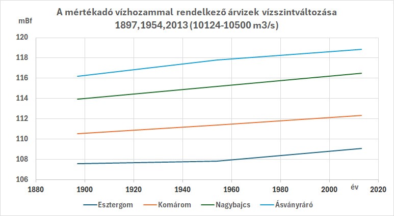 116 év alatt az árvízszintek emelkedtek: Ásványráró 1,58+1,07=2,65 m, Nagybajcs 1,29+1,28=2,57 m, Komárom 2,14 m, Esztergom 1,15 m