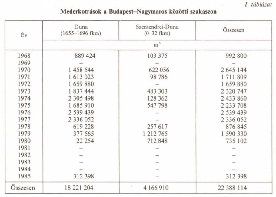 „… a mederemelkedések ellensúlyozására nagyarányú mederkotrást végeztek, melynek ütemét annyira fokozták, hogy a kiemelt kavics mennyisége elérje a lerakódó mennyiséget. 1956 –60 között a Baka–Szap közötti szakaszon közös erővel 1 240 000 m3 kotrást végeztünk, és miután egységes főmeder kiképzésére törekedtek, a kikotort kavicsanyagot a párhuzamművek mögé rakták, illetőleg a mellékágakat elzárni igyekeztek.