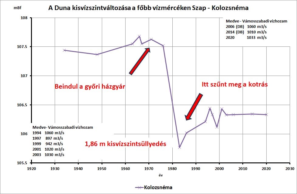 Bevallom, én is azok táborához tartoztam, akik azt gondolták, hogy a kotrásokból legalább annyi hasznunk lesz, hogy az árvízszintek mérséklődni fognak, hiszen az 1954-es szakítást pont a görgetett hordalék mennyisége okozta Ásványrárónál. Már 1991-ben, még az elterelés előtt rá kellett jönnöm, hogy ez nem így van. Rajkán, ahol 148 cm-es kisvízszintsüllyedés következett be 1954-1991 között, annak ellenére, hogy az érkező vízhozam 2154 m3/s-al kevesebb volt, mint 1954-ben, mindössze 90 cm-el alacsonyabb vízszint alakult ki. De a Duna alsóbb szakaszain is dőltek az LNV-k és legkésőbb 2013-ban szembesülni kellett azzal, hogy az árvízszintek annak ellenére döntöttek szinte végig a Duna mentén LNV-t, (LNV = legnagyobb vízszint), hogy a kisvízszintek átlagosan 1 m-t csökkentek. Az árvízszintek viszont az 1954 évihez képest, mint azt már a töltések c. fejezetben írtam, átlagosan 1 m-t emelkedtek.