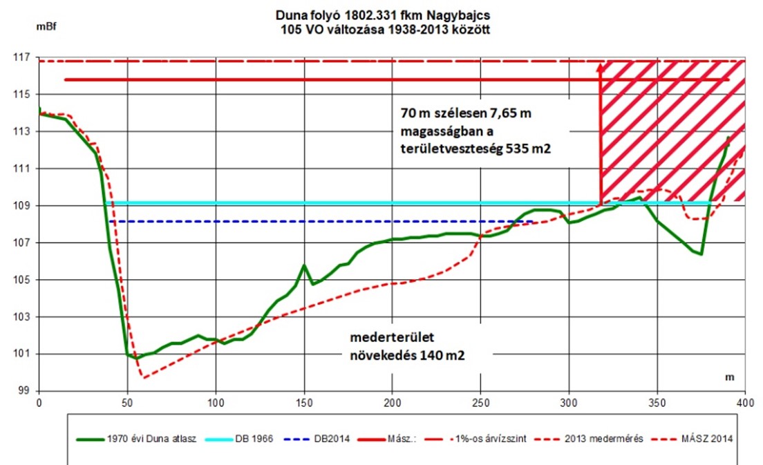 A következő ábrán a nagybajcsi szelvényt látjuk, ahol 1 m-es kisvízszintsüllyedés következett be 1966-2013 között, tehát az a határ, amely felett számolni kell a növényzettel, egybe esik a DB 1966 vízszinttel. Látható, hogy 70 m-el lett keskenyebb a meder, de mivel a fák koronája magasabb általában, mint 6-7 m, a teljes szelvényt képes lezárni. Ennek a területe 535 m2, ha 30-40%-ban átereszt, (de szerintem még ennél is kevesebb, mert gyakorlatilag a fák között álla víz, de ezt még nem mérték ki) még akkor is több, mint duplája a nagyvízi mederterület vesztesége a kotrásból adódó növekménynek, tehát jelentős nagyvízi mederterület-veszteséggel állunk annak ellenére szemben, hogy maga a mederterület növekedett. Ez a teljes Duna szakaszon tapasztalható volt és nagyban hozzájárult 2013-ban a rekord árvízszintek kialakulásához.