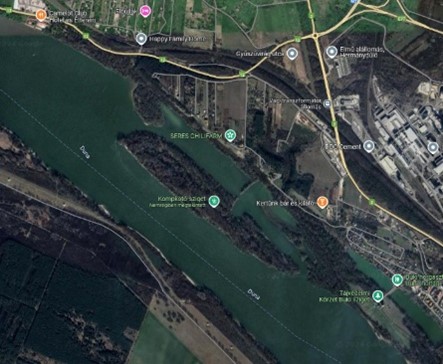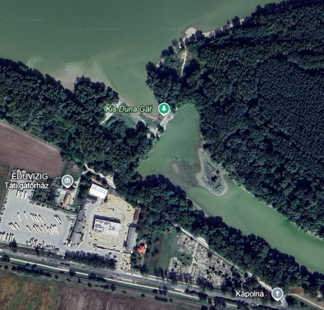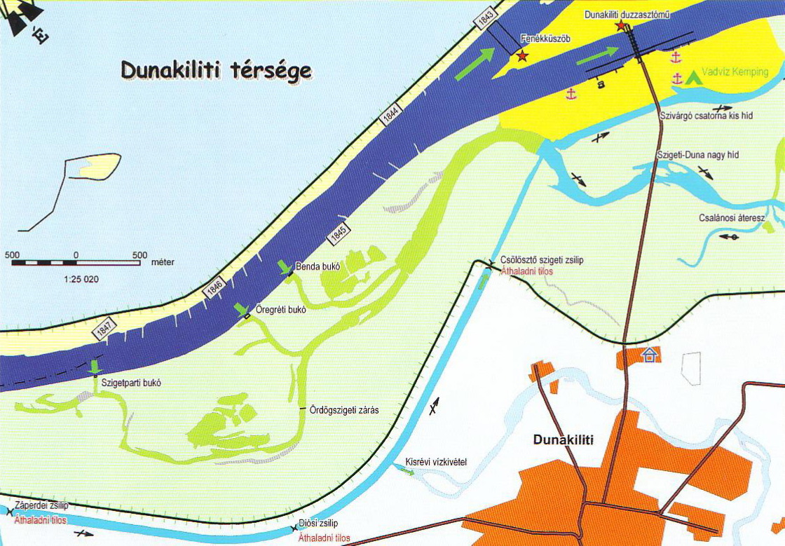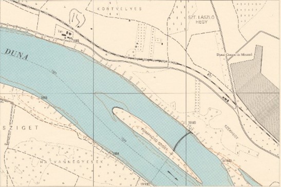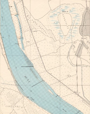 Budapesten a Kompkötő szigetnél a túl magassá lett keresztgát miatt a meder felét vesztettük el