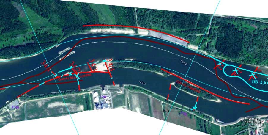 a) Itt a zátonyok letisztítása és lesüllyesztése, valamint a hajózható szakaszokon a sarkantyúk koronaszintjének csökkentése a jelenlegi kisvízszinthez igazítva hozhat megoldást. A zátonytisztítás a szigetközi szakaszon 30 km hosszba érinti a főmeder jobb és bal partját (Medvei híd és Denkpál közötti szakasz) és folyamatos fenntartást igényel, mert a zátonyok nem növényesedhetnek be. Ez, amennyiben erre van lehetőség, célszerű legeltetéssel megoldani és az ide telepített állatok téli takarmányozására a töltések kaszálásának szénáját felhasználni. Az 1820 fkm szelvény alatt ez azonban már feltehetően nem lesz elegendő, itt a zátonyok süllyesztésére is sort kell keríteni. Ennek mértékét a modellkísérletek határozzák meg. A lesüllyesztett zátonyokat visszahumuszolás után ugyanúgy lehet kezelni, mint a letisztítottakat. Ez a megoldás közös projektet feltételez a szlovák féllel.