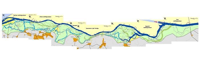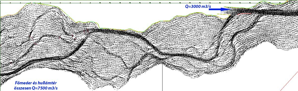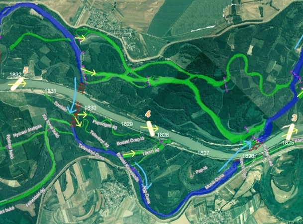 Ha pedig a felső szakaszon bejut a víz, akkor azt végig lehet vezetni a hullámtéren, de le kell zárni a korábbi természetes visszacsatlakozásokat a főmeder felé, hogy az első lehetséges helyen ne a főmederbe folyjon vissza, hanem a hullámtérbe maradjon a víz. A világoskékkel jelölt folyóágak mutatják azokat a szakaszokat, ahol a vízpótlás megvalósulhatott és a vízszintek méterekkel magasabbak lettek, mint a főmederben.
