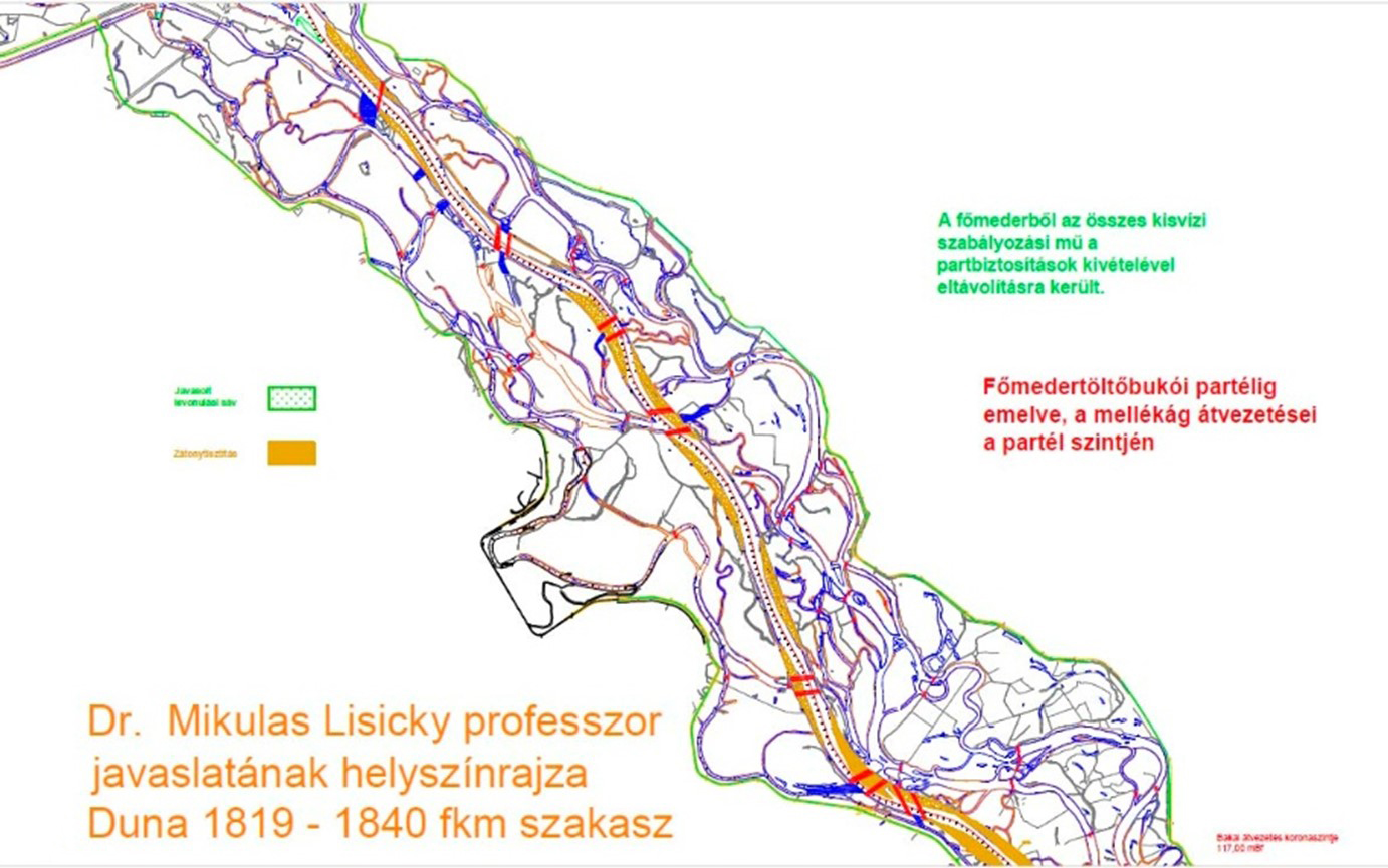 Az első Lisicky professzor javaslata volt. Ez a javaslat nem a fonatos ágrendszer helyreállítását célozta meg, hanem a mellékágak bevonásával egy meanderező folyót alakított volna ki. Ennek érdekében partélig emelt átvezetéseket alakított volna ki a Dunán kavicsból.