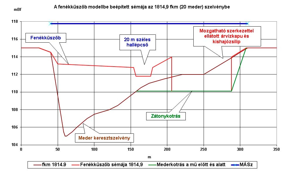 Érdekes új elem viszont a rajzon, hogy a fenékküszöböt áthelyezik, kb. az 1841 fkm szelvény környezetébe, és megnyitnak egy rávezetést a mellékágrendszerükre. Ezzel a bal parti mellékágrendszer Bősig a jelenleginél több vízhez jutna, ami indokolt, ugyanis a szlovák hullámtér, mely méretében hasonlít a magyar hullámtérhez, mindössze 30 m3/s vízpótlást kap a felvízcsatornából. (A magyar oldalon a 2016 évi rendszermérés adatai szerint a hullámtérbe beléptetett vízhozam 122 m3/s, és ezt a magyar fél még emelni tervezi 146 m3/s-ra. További emelés viszont sajnos nem lehetséges. Az eredeti tervben szereplő 200 m3/s vízhozam kiadása a hajózsilipen keresztül szintén nem lehetséges.)